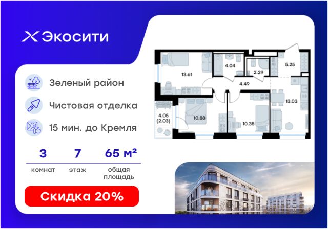 Продается 3-комн. квартира на 7-м этаже в строящемся проекте Экосити. Общая площадь лота составляет 65,97 кв. м, из которых 34,84 кв. м отведено под жилую и 13,03 кв. м под кухонную зону. Номер квартиры - 348