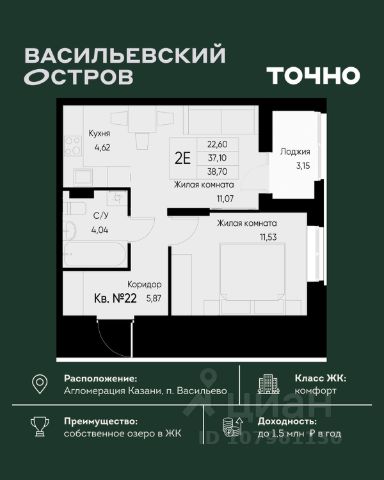 Продается 2-комн. квартира на 7-м этаже в строящемся проекте премиум-класса GloraX Premium Экосити. Общая площадь лота составляет 67,27 кв. м, из которых 23,48 кв. м отведено под жилую и 23,32 кв. м под кухонную зону. Номер квартиры - 37