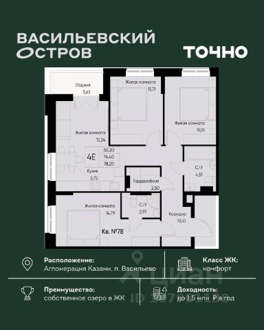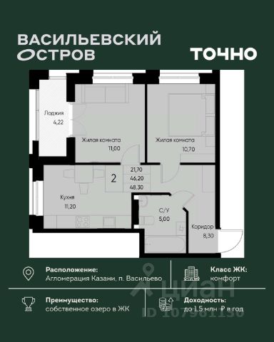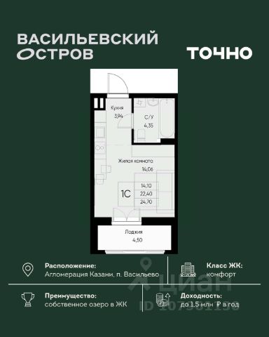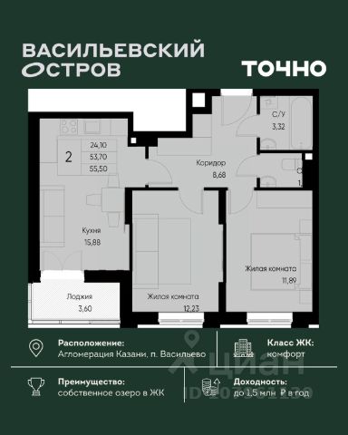ЖК "Васильевский остров" — масштабный проект ТОЧНО в Казанской агломерации. Просторная территория 88 Га спроектирована для комфортной жизни: озеро с набережной и пляжем, каток, зелёные маршруты. В проекте комплекса — школа на 1 224 места, 2 детских сада на 680 мест, детская и взрослая поликлиники, фитнес-центр с бассейном, термальный комплекс, фермерский рынок, магазины, кафе и рестораны.
