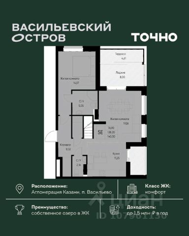 ЖК "Васильевский остров" — масштабный проект ТОЧНО в Казанской агломерации. Просторная территория 88 Га спроектирована для комфортной жизни: озеро с набережной и пляжем, каток, зелёные маршруты. В проекте комплекса — школа на 1 224 места, 2 детских сада на 680 мест, детская и взрослая поликлиники, фитнес-центр с бассейном, термальный комплекс, фермерский рынок, магазины, кафе и рестораны.