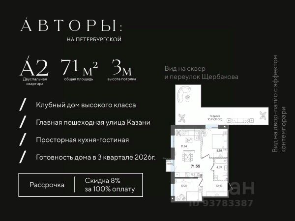 Вы можете приобрести эту квартиру в рассрочку с первоначальным взносом 30% и ежемесячным платежом 50 000 рублей. Подробнее - звоните! Продается 2-к квартира 37 в клубном доме "Авторы на Петербургской" на главной пешеходной улице Казани. Квартира на 4 этаже площадью 71,23 м², высотой потолков 3 м. Квартира сдается в свободной планировке, предоставляя полную свободу для ваших предпочтений в дизайне и возможность подстроить пространство под ваши жизненные ценности. Срок сдачи дома — 3-й квартал 2026 года. В клубном доме всего 68 квартир, включая 18 эксклюзивных пентхаусов. Возможно приобретение с полной оплатой (при полной оплате скидка 8%), в рассрочку с первым взносом 30% или 50% ( при приобретении в рассрочку с первым взносом 50% возможна скидка до 6% от стоимости), а также оформление ипотеки. Клубный дом "Авторы на Петербургской" расположен на главной пешеходной улице Казани в 3-х минутах до набережной озера "Нижний Кабан". Вы находитесь в самом центре: можно выйти из дома и быстро добраться в любую часть города, даже в час пик. В соответствии с современными стандартами бизнес-класса "Авторы" предлагают особые решения для вашего комфорта: • Закрытая территория с круглосуточным видеонаблюдением. • Подземный паркинг с электрозаправками, келлеры для хранения, умный въезд с распознаванием номеров. • Натуральные коллекционные материалы в лобби для создания атмосферы премиум-класса. Двор-патио с эффектом контепорари наполняет территорию дома тишиной и эстетикой, где каждый элемент выглядит как арт-объект, превращая двор в музей современного искусства. Также в пространстве дома есть детская зона — шалаш, где юные жители смогут придумать сотню новых игр с друзьями, а взрослые будут уверены в их безопасности. Компания "Авторы" — девелопер на рынке высококлассной недвижимости Казани. Как самостоятельный застройщик компания работает с 2022 года, а в начале 2024 года успешно сдали свой первый проект ЖК "Дом у озера", где 96% квартир были приняты дольщиками с первого раза и без критичных замечаний. Компания входит в ТОП-5 застройщиков РТ по потребительским качествам ЕРЗ. Сейчас компания ведет строительство проектов на ул. Большая, ул. Петербургская, ул. Годовикова и ул. Астрономическая