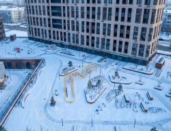 Выход в закрытый двор на стилобате осуществляется через холл второго этажа с зоной ресепшн. В холле для жителей предусмотрена зона отдыха, санузел, лапомойка (комната для мытья лап домашних животных), консьерж сервис.