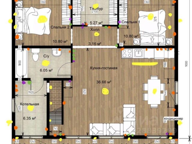 В доме 2 комнаты площадью 8,5 и 7,5 м², кухня-гостиная 28,6 м², совмещенный санузел с ванной 3,8 м², небольшая прихожая 3,9 м² и кладовая 3,7 м². В гостиной установлен кондиционер, зенитный фонарь. Вентиляция — приточные клапаны, принудительная вытяжка, приточная с подогревом (бризер).