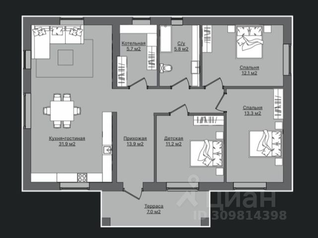 две спальные комнаты S 17.6кв.м., комната S 9,7 кв.м.