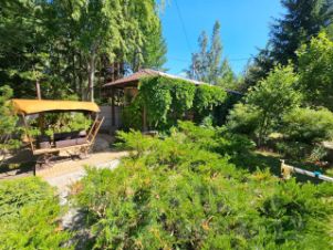 Территория двора огорожена и благоустроена: газоны, брусчатка. Весь двор утопает в зелени,45 елок , посаженными собственными руками хозяйки, березы,ивы, есть природный водоем с лотосами и дикими утками.