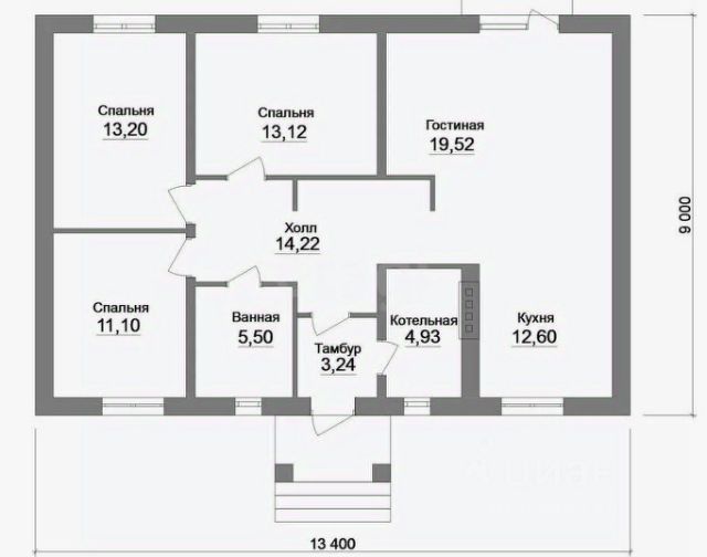 1 этаж: крыльцо, холл, котельная (можно сделать 2й СУ ), СУ, кухня-гостиная, спальня, большая терраса (капитальная, на всю ширину дома)