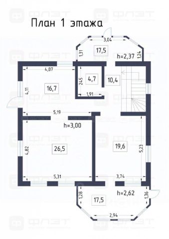 1 этаж: входная группа, гардеробная, зал. кухня-столовая, сауна с бассейном и комнатой отдыха, с/у, котельная.