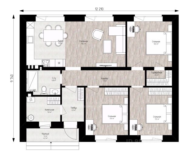 Входная группа, просторная кухня-гостиная с выходом на террасу, 5 спальных комнат, 2 санузла, гардероб