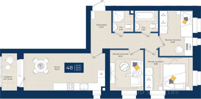 Общая площадь - 51,7 кв.м;
