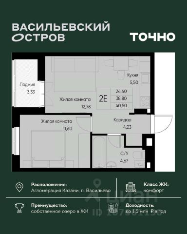 - Просторная кухня-гостиная площадью 34,3 кв.м., идеально подходит для семейных ужинов и приёма гостей.