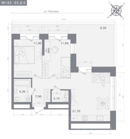 Продаётся 2-комнатная квартира в строящемся доме (Дом 1), срок сдачи: IV-кв. 2027, общей площадью 65.8 кв.м., на 13 этаже.