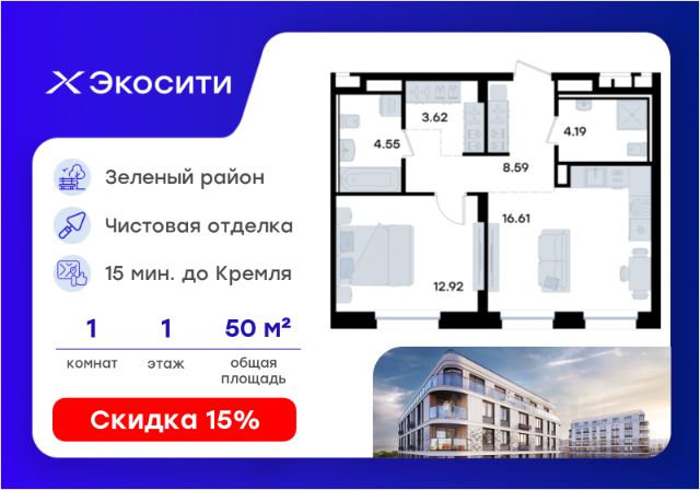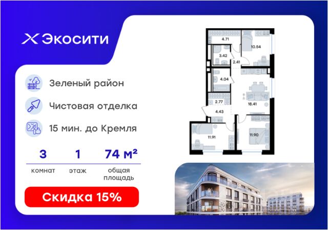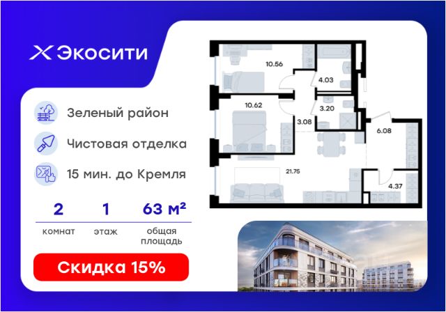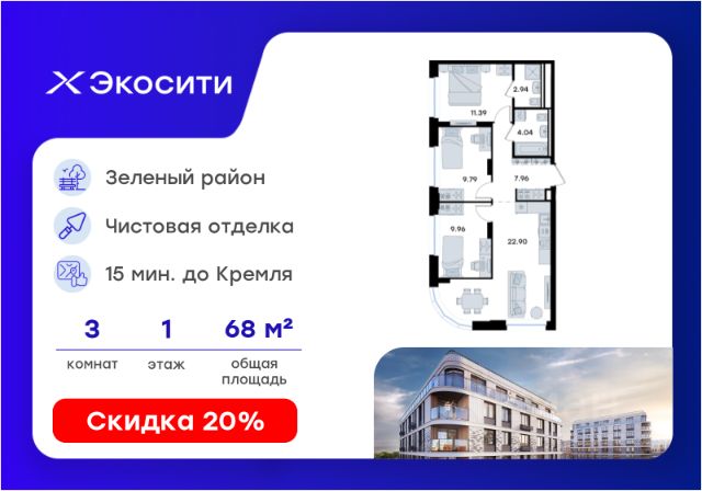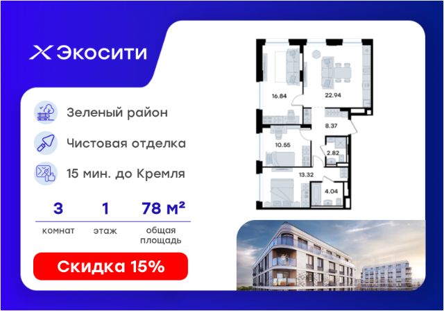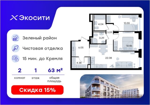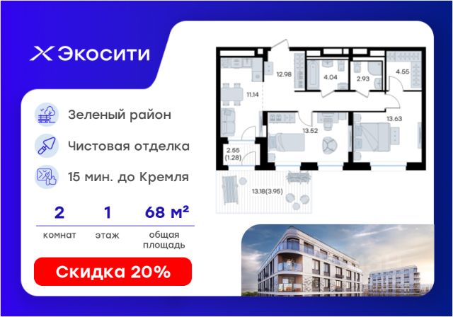 Продается 2-комн. квартира на 1-м этаже в строящемся проекте Экосити. Общая площадь лота составляет 56,82 кв. м, из которых 24,69 кв. м отведено под жилую и 18,50 кв. м под кухонную зону. Номер квартиры - 355 Преимущества квартиры в Урбан-квартале: • Квартира с полностью чистовой отделкой. В комнатах и коридоре: - натяжной потолок, - стены оклеены обоями под покраску, - полы: ламинат, плинтусы и напольная плитки - установлены межкомнатные двери и подоконники. В санузлах: - на стенах - керамогранитная плитка и/или окраска водостойкой краской - на полу - керамогранитная плитка; - натяжной потолок - сантехника: ванна и экран под ванну/душевой поддон, унитаз, раковины и смесители, монтаж водопровода и канализации - Предусмотрен расширенный пакет системы Умный Дом: бесключевой доступ в подъезд, видеодомофон с функцией Face ID, видеонаблюдение, автоматизированный сбор и передача показаний счётчиков; - На территории Урбан-квартала предусмотрено строительство детского сада на 360 мест, школы на 1501 место, детский развивающий центр на 2000 мест. - Рядом с с кварталом Резиденции запланировано строительство детского сада на 360 мест, школы с детским развивающим центром на 1501 место - На первых этажах домов Урбан-квартала запроектированы коммерческие помещения - предусмотрены места для супермаркетов, бытовых услуг, кафе. - Собственный комьюнити-центр для жителей Урбан-квартала - Клуб Резидентов для жителей квартала Резиденции - бульвар "Река между камней" с плейхабом для детей, амфитеатром, спортивными зонами, аллеей достижений. Всем посетителям будет доступен иммерсивный маршрут и AR-игры. - Тайная тропа вдоль которой расположатся зоны тихого отдыха, йоги и медитаций - 2 смотровые площадки - Снейк-ран - Круговой спортивный маршрут - Специальные зоны для выгула собак - В Урбан-квартале предусмотрено строительство 2 многоэтажных паркингов на 300 и 360 машиномест. Всем жителям проекта доступен и привычный плоскостной паркинг вокруг территории проекта с возможностью в приложении дома получить информацию о наличии парковочных мест. - В квартале Резиденции предусмотрен подземный паркинг на 260 машиномест Экосити — это совершенство города в первозданной природе. Наполненный возможностями квартал, в котором вы не выбираете между городом или природой, семьей или работой, отдыхом или спортом, — вы берете всё сразу. Каждая семья, каким бы составом она ни жила, найдет для себя идеальное пространство. Планировочные решения разнообразны, также как и возможности отделки от черновой до полностью с ремонтом. Здесь запроектированы квартиры с просторной кухней-гостиной, чтобы семья могла комфортно проводить время вместе. Квартиры сдаются с современной качественной отделкой, что позволяет после сдачи дома сразу начать жить, избежав долгих самостоятельных ремонтов. Цветовые решения и стиль отделки можно выбрать при покупке квартиры. Резиденции сдаются в черновой отделке, вы могли реализовать ваши самые смелые дизайнерские решения. Каждая резиденция это баз