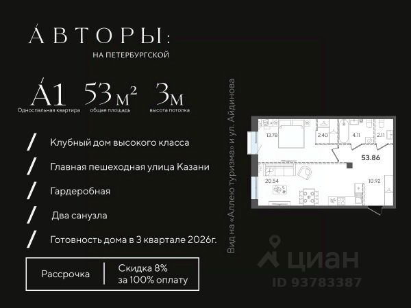 Вы можете приобрести эту квартиру в рассрочку с первоначальным взносом 20% и ежемесячным платежом 150 000 рублей. Подробнее - звоните! Продается 1-к квартира 7 в клубном доме "Авторы на Петербургской" на главной пешеходной улице Казани. Квартира на 1 этаже площадью 53,86 м², высотой потолков 3 м. Квартира сдается в свободной планировке, предоставляя полную свободу для ваших предпочтений в дизайне и возможность подстроить пространство под ваши жизненные ценности. Срок сдачи дома — 3-й квартал 2026 года. В клубном доме всего 68 квартир, включая 18 эксклюзивных пентхаусов. Возможно приобретение с полной оплатой (при полной оплате скидка 8%), в рассрочку с первым взносом 20%, 30% или 50% ( при приобретении в рассрочку с первым взносом 50% возможна скидка до 6% от стоимости), а также оформление ипотеки. Клубный дом "Авторы на Петербургской" расположен на главной пешеходной улице Казани в 3-х минутах до набережной озера "Нижний Кабан". Вы находитесь в самом центре: можно выйти из дома и быстро добраться в любую часть города, даже в час пик. В соответствии с современными стандартами бизнес-класса "Авторы" предлагают особые решения для вашего комфорта: • Закрытая территория с круглосуточным видеонаблюдением. • Подземный паркинг с электрозаправками, келлеры для хранения, умный въезд с распознаванием номеров. • Натуральные коллекционные материалы в лобби для создания атмосферы премиум-класса. Двор-патио с эффектом контепорари наполняет территорию дома тишиной и эстетикой, где каждый элемент выглядит как арт-объект, превращая двор в музей современного искусства. Также в пространстве дома есть детская зона — шалаш, где юные жители смогут придумать сотню новых игр с друзьями, а взрослые будут уверены в их безопасности. Компания "Авторы" — девелопер на рынке высококлассной недвижимости Казани. Как самостоятельный застройщик компания работает с 2022 года, а в начале 2024 года успешно сдали свой первый проект ЖК "Дом у озера", где 96% квартир были приняты дольщиками с первого раза и без критичных замечаний. Компания входит в ТОП-5 застройщиков РТ по потребительским качествам ЕРЗ. Сейчас компания ведет строительство проектов на ул. Большая, ул. Петербургская, ул. Годовикова и ул. Астрономическая.