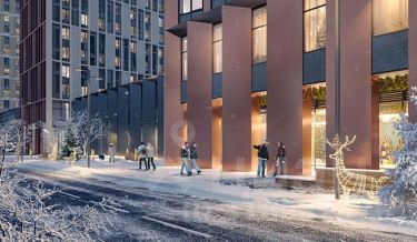 Отделка первых этажей выполнена из клинкерного кирпича — износостойкого материала, который хорошо переносит перепады температур. На нижнем этаже откроются кафе, магазины и другие сервисы — чтобы купить кофе к завтраку или пиццу на ужин, можно будет просто спуститься на лифте. На подземном этаже будут кладовые для крупных и сезонных вещей, а на первом этаже — комната для хранения колясок.