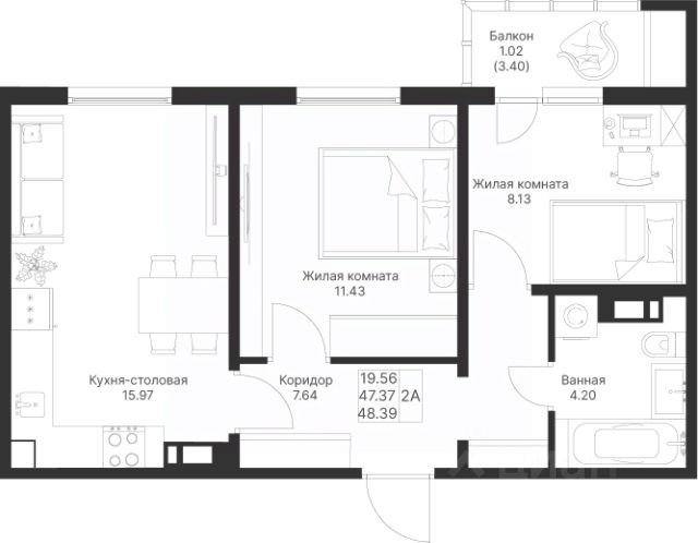 Просторная 2-комнатная квартира создаёт комфортные условия для жизни всей семьи. Главный акцент — большая кухня-гостиная. Здесь удобно готовить, собираться за общим столом и проводить время вместе.