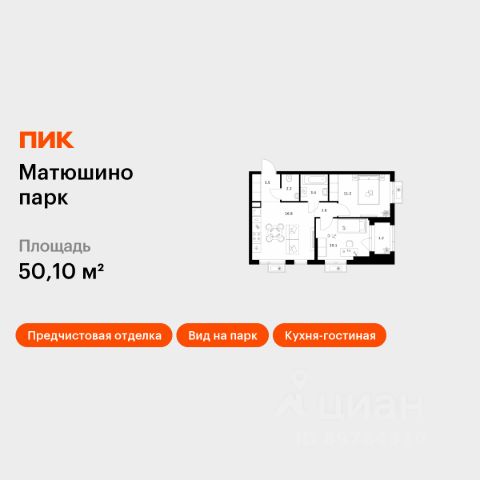 Продается 2-комнатная квартира 100 площадью 49,91 кв.м на 11 этаже в строящемся ПК 1-3 доме проекта "Дома у сада" компании "Aк Барс Дом".