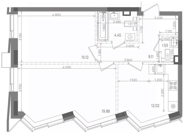 - раздельный санузел 6,1 и 2,48 кв.м.