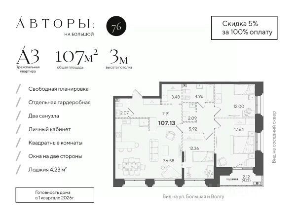 Продается 3-к квартира 1 в клубном доме "Авторы на Большой 62". Квартира с тремя спальнями на 2 этаже площадью 103.23 м², кухней-гостинной площадью 24 м², высотой потолков 3 м и двумя санузлами. Окна выходят на две стороны и открывают вид на Казанский Кремль, Волгу и дзен-двор с обильным озеленением. Квартира сдается в свободной планировке, предоставляя полную свободу для ваших предпочтений в дизайне и возможность подстроить пространство под ваши жизненные ценности. Срок сдачи дома — 1-й квартал 2026 года. В клубном доме всего 27 квартир, включая 2 эксклюзивных пентхауса. Проект "Авторы на Большой" входит в ТОП-3 малоквартирных домов в Казани, а также входит в ТОП-3 ЖК по результатам конкурса форума "Казаныш". Квартиры в домах бизнес-класса "Авторы на Большой" расположены всего в 7-ми минутах от исторического центра Казани и в 2-х минутах от новой соборной мечети, начало строительства которой запланировано на 2025 год. Исключительное местоположение проекта позволяет насладиться видом на Волгу, а концепция клубного дома создаёт атмосферу уединения и спокойствия в самом сердце города. В соответствии с современными стандартами бизнес-класса "Авторы" предлагают особые рещения для вашего комфорта: • Закрытая территория с круглосуточным видеонаблюдением. • Подземный паркинг с электрозаправками, келлеры для хранения, умный въезд с распознаванием номеров. • Натуральные коллекционные материалы в лобби для создания атмосферы премиум-класса. Дзен-двор разработан в концепции "городской гостиной", оснащенной барной сткойкой для уютных встреч и коворкингом для комфортной работы на открытом воздухе. Детская зона вдохновлена тематикой реки и её естественной средой. Площадь двора составляет 1100 м², на которых расположатся более 15 видов декоративных растений и цветников. Компания "Авторы" — девелопер на рынке высококлассной недвижимости Казани. Как самостоятельный застройщик компания работает с 2022 года, а в начале 2024 года успешно сдали свой первый проект ЖК "Дом у озера", где 96% квартир были приняты дольщиками с первого раза и без критичных замечаний. Компания входит в ТОП-5 застройщиков РТ по потребительским качествам ЕРЗ. Сейчас компания ведет строительство проектов на ул. Большая, ул. Петербургская, ул. Годовикова и ул. Астрономическая Подробнее - звоните!