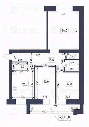 - изолированные жилые комнаты 24,6; 13,6 и 12,8 кв.м.