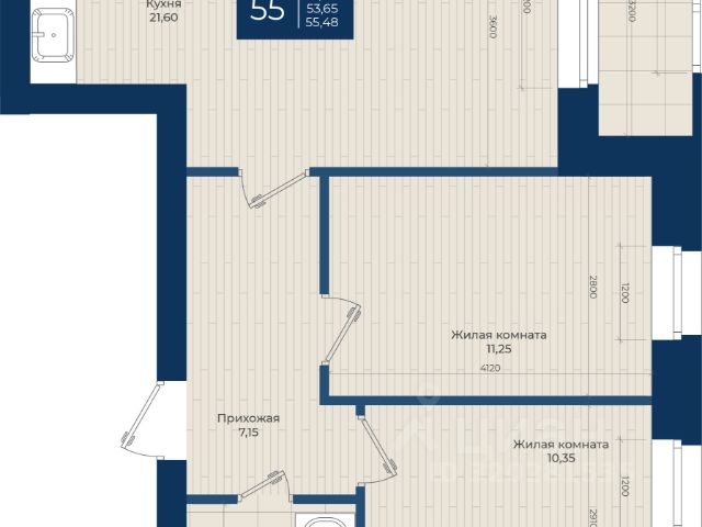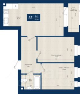 Продается 2-х комнатная квартира c большой кухней-гостиной площадью 52,9 м²