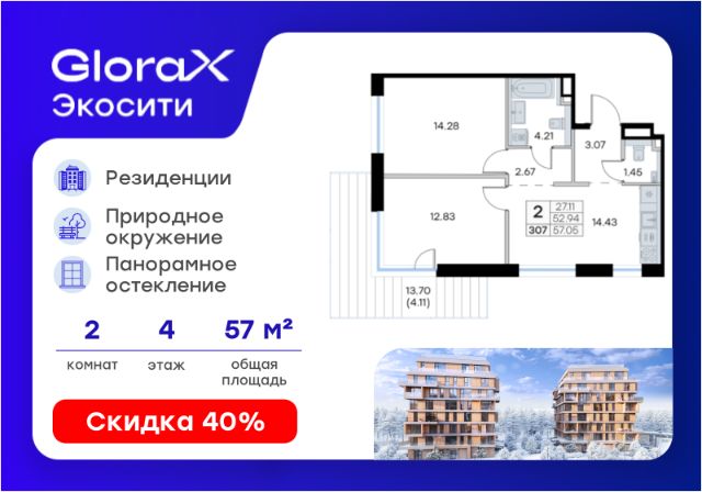 Продаётся 2-комнатная квартира в строящемся доме (Урбан-блок 2), срок сдачи: II-кв. 2028, общей площадью 64.83 кв.м., на 4 этаже. Проект "GloraX Экосити" - настоящий оазис природы в черте города. Масштабный проект комфорт-класса расположится в спокойном зеленом районе Аракчино Кировского района. Те, кто проезжал это место хорошо знают его красоту и аутентичность. Главное преимущество "GloraX Экосити" - это расположение. Вы в городе за городом. Здесь нам удалось создать идеальные условия для жизни в городе и за его пределами. Чтобы подчеркнуть природную идентичность места, была создана архитектурная концепция, в основу которой легли природные цвета, текстуры, материалы и формы. Мы спроектировали высокотехнологичную урбанистическую среду, которая позволяет жить, развиваться и отдыхать. Здесь дела - вроде похода по магазинам или дороги до школы - занимают несколько минут. А эмоции - наполняют всю жизнь.