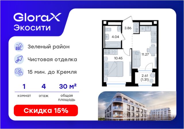 Продаётся 1-комнатная квартира в строящемся доме (Корпус 1), срок сдачи: II-кв. 2028, общей площадью 30.59 кв.м., на 4 этаже. GloraX Урицкого - это новый квартал, рожденный в сердце Московского района Казани, там, где встречаются энергия большого города и тишина старых парков. Проект создает пространство для тех, кто хочет чувствовать себя в центре событий, но при этом возвращаться домой в атмосферу уюта и спокойствия. Главная идея комплекса - гармония города и природы. Здесь архитектура строгих линий сочетается с зеленью двора, напоминающего природный лесопарк, где воплощается многообразие сценариев жизни: от утренней зарядки в зоне воркаута до вечерних прогулок по уютным аллеям и встреч в комьюнити-центре. GloraX Урицкого становится главной доминантой района, новым символом современности, задающим новый уровень качества городской среды. Переменная этажность открывает панорамы города, а динамичные фасады придают ансамблю элегантность и стройность. Этот проект словно открывает новую главу в истории Московского района.