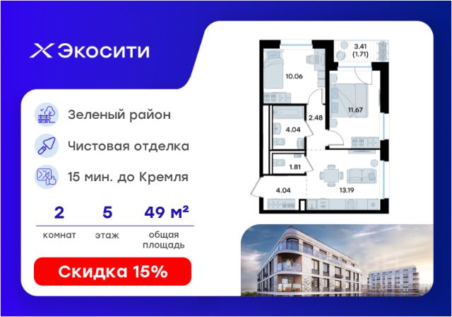 Продается 2-комн. квартира на 5-м этаже в строящемся проекте Экосити. Общая площадь лота составляет 43,50 кв. м, из которых 21,66 кв. м отведено под жилую и 9,76 кв. м под кухонную зону. Номер квартиры - 280 Преимущества квартиры в Урбан-квартале: • Квартира с полностью чистовой отделкой. В комнатах и коридоре: - натяжной потолок, - стены оклеены обоями под покраску, - полы: ламинат, плинтусы и напольная плитки - установлены межкомнатные двери и подоконники. В санузлах: - на стенах - керамогранитная плитка и/или окраска водостойкой краской - на полу - керамогранитная плитка; - натяжной потолок - сантехника: ванна и экран под ванну/душевой поддон, унитаз, раковины и смесители, монтаж водопровода и канализации - Предусмотрен расширенный пакет системы Умный Дом: бесключевой доступ в подъезд, видеодомофон с функцией Face ID, видеонаблюдение, автоматизированный сбор и передача показаний счётчиков; - На территории Урбан-квартала предусмотрено строительство детского сада на 360 мест, школы на 1501 место, детский развивающий центр на 2000 мест. - Рядом с с кварталом Резиденции запланировано строительство детского сада на 360 мест, школы с детским развивающим центром на 1501 место - На первых этажах домов Урбан-квартала запроектированы коммерческие помещения - предусмотрены места для супермаркетов, бытовых услуг, кафе. - Собственный комьюнити-центр для жителей Урбан-квартала - Клуб Резидентов для жителей квартала Резиденции - бульвар "Река между камней" с плейхабом для детей, амфитеатром, спортивными зонами, аллеей достижений. Всем посетителям будет доступен иммерсивный маршрут и AR-игры. - Тайная тропа вдоль которой расположатся зоны тихого отдыха, йоги и медитаций - 2 смотровые площадки - Снейк-ран - Круговой спортивный маршрут - Специальные зоны для выгула собак - В Урбан-квартале предусмотрено строительство 2 многоэтажных паркингов на 300 и 360 машиномест. Всем жителям проекта доступен и привычный плоскостной паркинг вокруг территории проекта с возможностью в приложении дома получить информацию о наличии парковочных мест. - В квартале Резиденции предусмотрен подземный паркинг на 260 машиномест Экосити — это совершенство города в первозданной природе. Наполненный возможностями квартал, в котором вы не выбираете между городом или природой, семьей или работой, отдыхом или спортом, — вы берете всё сразу. Каждая семья, каким бы составом она ни жила, найдет для себя идеальное пространство. Планировочные решения разнообразны, также как и возможности отделки от черновой до полностью с ремонтом. Здесь запроектированы квартиры с просторной кухней-гостиной, чтобы семья могла комфортно проводить время вместе. Квартиры сдаются с современной качественной отделкой, что позволяет после сдачи дома сразу начать жить, избежав долгих самостоятельных ремонтов. Цветовые решения и стиль отделки можно выбрать при покупке квартиры. Резиденции сдаются в черновой отделке, вы могли реализовать ваши самые смелые дизайнерские решения. Каждая резиденция это база