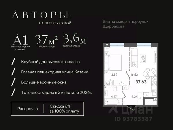 Вы можете приобрести эту квартиру в рассрочку с первоначальным взносом 20% и ежемесячным платежом 150 000 рублей. Подробнее - звоните! Продается односпальный пентхаус 69 в клубном доме "Авторы на Петербургской" на главной пешеходной улице Казани. Квартира на 5 этаже площадью 47,35 м², высотой потолков до 3,6 м. Квартира сдается в свободной планировке, предоставляя полную свободу для ваших предпочтений в дизайне и возможность подстроить пространство под ваши жизненные ценности. Исключительная планировка с большими арочными окнами наполняет квартиру светом в течение дня, а вечером открывает захватывающий вид на закат и уютные панорамы Казани. Срок сдачи дома — 3-й квартал 2026 года. В клубном доме всего 68 квартир, включая 18 эксклюзивных пентхаусов. Возможно приобретение с полной оплатой (при полной оплате скидка 8%), в рассрочку с первым взносом 20%, 30% или 50% ( при приобретении в рассрочку с первым взносом 50% возможна скидка до 6% от стоимости), а также оформление ипотеки. Клубный дом "Авторы на Петербургской" расположен на главной пешеходной улице Казани в 3-х минутах до набережной озера "Нижний Кабан". Вы находитесь в самом центре: можно выйти из дома и быстро добраться в любую часть города, даже в час пик. В соответствии с современными стандартами бизнес-класса "Авторы" предлагают особые решения для вашего комфорта: • Закрытая территория с круглосуточным видеонаблюдением. • Подземный паркинг с электрозаправками, келлеры для хранения, умный въезд с распознаванием номеров. • Натуральные коллекционные материалы в лобби для создания атмосферы премиум-класса. Двор-патио с эффектом контепорари наполняет территорию дома тишиной и эстетикой, где каждый элемент выглядит как арт-объект, превращая двор в музей современного искусства. Также в пространстве дома есть детская зона — шалаш, где юные жители смогут придумать сотню новых игр с друзьями, а взрослые будут уверены в их безопасности. Компания "Авторы" — девелопер на рынке высококлассной недвижимости Казани. Как самостоятельный застройщик компания работает с 2022 года, а в начале 2024 года успешно сдали свой первый проект ЖК "Дом у озера", где 96% квартир были приняты дольщиками с первого раза и без критичных замечаний. Компания входит в ТОП-5 застройщиков РТ по потребительским качествам ЕРЗ. Сейчас компания ведет строительство проектов на ул. Большая, ул. Петербургская, ул. Годовикова и ул. Астрономическая.