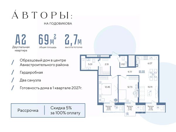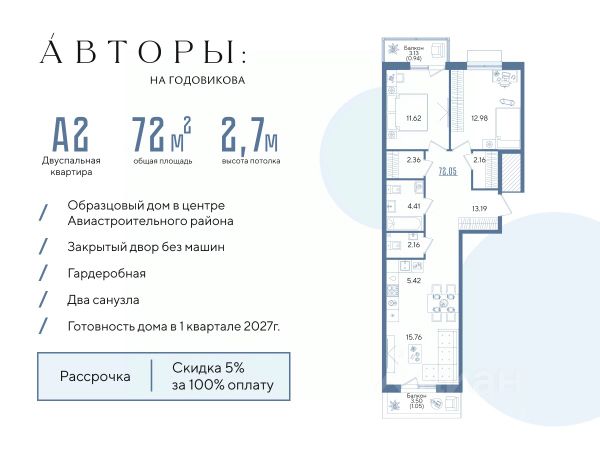 Вы можете приобрести эту квартиру по семейной ипотеке от 6%. Подробнее - звоните! Продается 2-к квартира 35 в образцовом доме "Авторы на Годовикова" в центре Авиастроительного района. Квартира на 6 этаже площадью 72.05 м², кухней-гостиной и высотой потолков 2.7 м. Квартира сдается в предчистовой отделке со стяжкой полов, предоставляя полную свободу для ваших предпочтений в дизайне. Срок сдачи дома — 1-й квартал 2027 года. Возможно приобретение со скидкой 5% при полной оплате, в рассрочку с первым взносом 30%, а также оформление стандартной ипотеки по интересным условиям. Образцовый дом "Авторы на Годовикова" расположен в тихой зоне, удаленной от активной дороги — на второй линии от улицы Максимова. Соседство с невысокими частными домами открывает превосходный вид из квартиры. Для прогулок на свежем воздухе в шаговой доступности Караваевский парк и парк "Крылья Советов". В соответствии с современными стандартами комфорт-класса "Авторы" предлагают особые решения для вашего комфорта: • Современная архитектура. • Закрытый двор без машин. • Дизайнерские холлы с зонами ожидания и детской комнатой. • Подземный паркинг. • Зона для хвостатых. Двор в концепции траектории полета создает единую линию движения. На территории дома есть многофункциональная зона для йоги и настольных игр, детская зона для комфортных прогулок юных жителей, многофункциональная спортивная площадка со скалолазанием и площадка для выгула собак. Обильное озеленение из 25 видов растений и несколько игровых зон для юных жителей разных возратов: для детей до 3-х лет — песочница, горка и качели; для детей от 4 до 14 лет — большой игровой комплекс, включающий горки, качели, карусели, переговорные трубы и мягкую геопластику, в которой прячутся тоннели. Компания "Авторы" — девелопер на рынке высококлассной недвижимости Казани. Как самостоятельный застройщик компания работает с 2022 года, а в начале 2024 года успешно сдали свой первый проект ЖК "Дом у озера", где 96% квартир были приняты дольщиками с первого раза и без критичных замечаний. Компания входит в ТОП-5 застройщиков РТ по потребительским качествам ЕРЗ. Сейчас компания ведет строительство проектов на ул. Большая, ул. Петербургская, ул. Годовикова и ул. Астрономическая