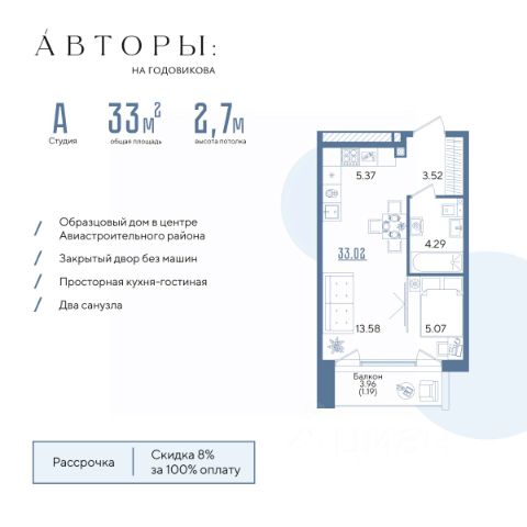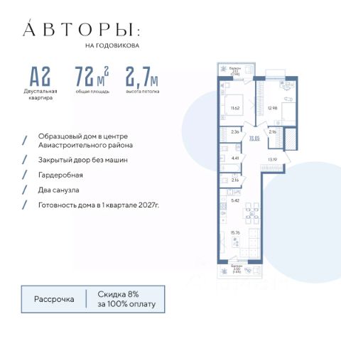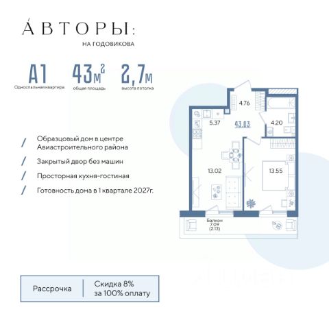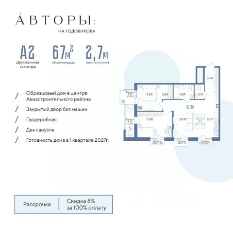 Вы можете приобрести эту квартиру в ипотеку с первоначальным взносом от 20% и со ставкой от 5,9% для всех, а не только по семейной программе. Подробнее - звоните! Продается 2-к квартира 64 в образцовом доме "Авторы на Годовикова" в центре Авиастроительного района. Квартира на 6 этаже площадью 69.07 м², кухней-гостиной и высотой потолков 2.7 м. Квартира сдается в предчистовой отделке со стяжкой полов, предоставляя полную свободу для ваших предпочтений в дизайне. Срок сдачи дома — 1-й квартал 2027 года. Возможно приобретение со скидкой 8% при полной оплате(акция действительная до 31.07.2026г.), в рассрочку с первым взносом 30%, а также оформление стандартной ипотеки по интересным условиям. Образцовый дом "Авторы на Годовикова" расположен в тихой зоне, удаленной от активной дороги — на второй линии от улицы Максимова. Соседство с невысокими частными домами открывает превосходный вид из квартиры. Для прогулок на свежем воздухе в шаговой доступности Караваевский парк и парк "Крылья Советов". В соответствии с современными стандартами комфорт-класса "Авторы" предлагают особые решения для вашего комфорта: • Современная архитектура. • Закрытый двор без машин. • Дизайнерские холлы с зонами ожидания и детской комнатой. • Подземный паркинг. • Зона для хвостатых. Двор в концепции траектории полета создает единую линию движения. На территории дома есть многофункциональная зона для йоги и настольных игр, детская зона для комфортных прогулок юных жителей, многофункциональная спортивная площадка со скалолазанием и площадка для выгула собак. Обильное озеленение из 25 видов растений и несколько игровых зон для юных жителей разных возратов: для детей до 3-х лет — песочница, горка и качели; для детей от 4 до 14 лет — большой игровой комплекс, включающий горки, качели, карусели, переговорные трубы и мягкую геопластику, в которой прячутся тоннели. Компания "Авторы" — девелопер на рынке высококлассной недвижимости Казани. Как самостоятельный застройщик компания работает с 2022 года, а в начале 2024 года успешно сдали свой первый проект ЖК "Дом у озера", где 96% квартир были приняты дольщиками с первого раза и без критичных замечаний. Компания входит в ТОП-5 застройщиков РТ по потребительским качествам ЕРЗ. Сейчас компания ведет строительство проектов на ул. Большая, ул. Петербургская, ул. Годовикова и ул. Астрономическая