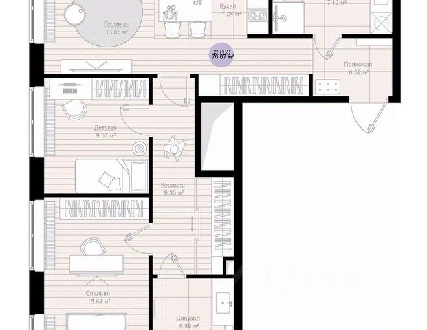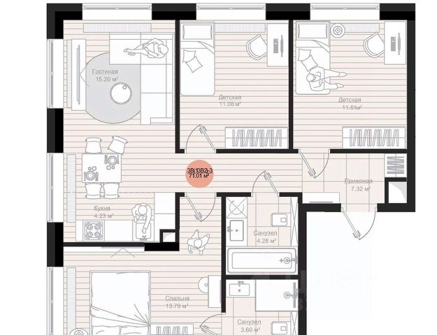 Спальня 13 кв.м. — обеспечивает приватность и хорошую инсоляцию.