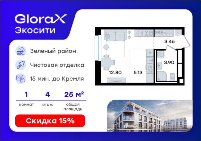 Продается квартира-студия на 4-м этаже в строящемся проекте GloraX Экосити. Общая площадь лота составляет 25,29 кв. м, из которых 12,80 кв. м отведено под жилую и 5,13 кв. м под кухонную зону. Номер квартиры - 137 Преимущества квартиры в Урбан-квартале: • Квартира с полностью чистовой отделкой. В комнатах и коридоре: - натяжной потолок, - стены оклеены обоями под покраску, - полы: ламинат, плинтусы и напольная плитки - установлены межкомнатные двери и подоконники. В санузлах: - на стенах - керамогранитная плитка и/или окраска водостойкой краской - на полу - керамогранитная плитка; - натяжной потолок - сантехника: ванна и экран под ванну/душевой поддон, унитаз, раковины и смесители, монтаж водопровода и канализации - Предусмотрен расширенный пакет системы Умный Дом: бесключевой доступ в подъезд, видеодомофон с функцией Face ID, видеонаблюдение, автоматизированный сбор и передача показаний счётчиков; - На территории Урбан-квартала предусмотрено строительство детского сада на 360 мест, школы на 1501 место, детский развивающий центр на 2000 мест. - Рядом с с кварталом Резиденции запланировано строительство детского сада на 360 мест, школы с детским развивающим центром на 1501 место - На первых этажах домов Урбан-квартала запроектированы коммерческие помещения - предусмотрены места для супермаркетов, бытовых услуг, кафе. - Собственный комьюнити-центр для жителей Урбан-квартала - Клуб Резидентов для жителей квартала Резиденции - бульвар "Река между камней" с плейхабом для детей, амфитеатром, спортивными зонами, аллеей достижений. Всем посетителям будет доступен иммерсивный маршрут и AR-игры. - Тайная тропа вдоль которой расположатся зоны тихого отдыха, йоги и медитаций - 2 смотровые площадки - Снейк-ран - Круговой спортивный маршрут - Специальные зоны для выгула собак - В Урбан-квартале предусмотрено строительство 2 многоэтажных паркингов на 300 и 360 машиномест. Всем жителям проекта доступен и привычный плоскостной паркинг вокруг территории проекта с возможностью в приложении дома получить информацию о наличии парковочных мест. - В квартале Резиденции предусмотрен подземный паркинг на 260 машиномест GloraX Экосити — это совершенство города в первозданной природе. Наполненный возможностями квартал, в котором вы не выбираете между городом или природой, семьей или работой, отдыхом или спортом, — вы берете всё сразу. Каждая семья, каким бы составом она ни жила, найдет для себя идеальное пространство. Планировочные решения разнообразны, также как и возможности отделки от черновой до полностью с ремонтом. Здесь запроектированы квартиры с просторной кухней-гостиной, чтобы семья могла комфортно проводить время вместе. Квартиры сдаются с современной качественной отделкой, что позволяет после сдачи дома сразу начать жить, избежав долгих самостоятельных ремонтов. Цветовые решения и стиль отделки можно выбрать при покупке квартиры. Резиденции сдаются в черновой отделке, вы могли реализовать ваши самые смелые дизайнерские решения. Каждая резиденци