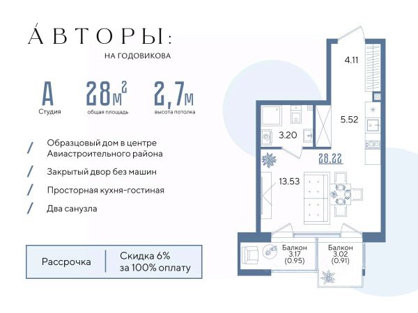Вы можете приобрести эту квартиру в ипотеку со ставкой от 4% (семейная ипотека). Подробнее - звоните! Продается студия 167 в образцовом доме "Авторы на Годовикова" в центре Авиастроительного района. Квартира на 13 этаже площадью 28.22 м², кухней-гостиной и высотой потолков 2.7 м. Квартира сдается в предчистовой отделке со стяжкой полов, предоставляя полную свободу для ваших предпочтений в дизайне. Срок сдачи дома — 1-й квартал 2027 года. Возможно приобретение со скидкой 6% при полной оплате, в рассрочку с первым взносом 30%, а также оформление ипотеки. Образцовый дом "Авторы на Годовикова" расположен в тихой зоне, удаленной от активной дороги — на второй линии от улицы Максимова. Соседство с невысокими частными домами открывает превосходный вид из квартиры. Для прогулок на свежем воздухе в шаговой доступности Караваевский парк и парк "Крылья Советов". В соответствии с современными стандартами комфорт-класса "Авторы" предлагают особые решения для вашего комфорта: • Современная архитектура. • Закрытый двор без машин. • Дизайнерские холлы с зонами ожидания и детской комнатой. • Подземный паркинг. • Зона для хвостатых. Двор в концепции траектории полета создает единую линию движения. На территории дома есть многофункциональная зона для йоги и настольных игр, детская зона для комфортных прогулок юных жителей, многофункциональная спортивная площадка со скалолазанием и площадка для выгула собак. Обильное озеленение из 25 видов растений и несколько игровых зон для юных жителей разных возратов: для детей до 3-х лет — песочница, горка и качели; для детей от 4 до 14 лет — большой игровой комплекс, включающий горки, качели, карусели, переговорные трубы и мягкую геопластику, в которой прячутся тоннели. Компания "Авторы" — девелопер на рынке высококлассной недвижимости Казани. Как самостоятельный застройщик компания работает с 2022 года, а в начале 2024 года успешно сдали свой первый проект ЖК "Дом у озера", где 96% квартир были приняты дольщиками с первого раза и без критичных замечаний. Компания входит в ТОП-5 застройщиков РТ по потребительским качествам ЕРЗ. Сейчас компания ведет строительство проектов на ул. Большая, ул. Петербургская, ул. Годовикова и ул. Астрономическая