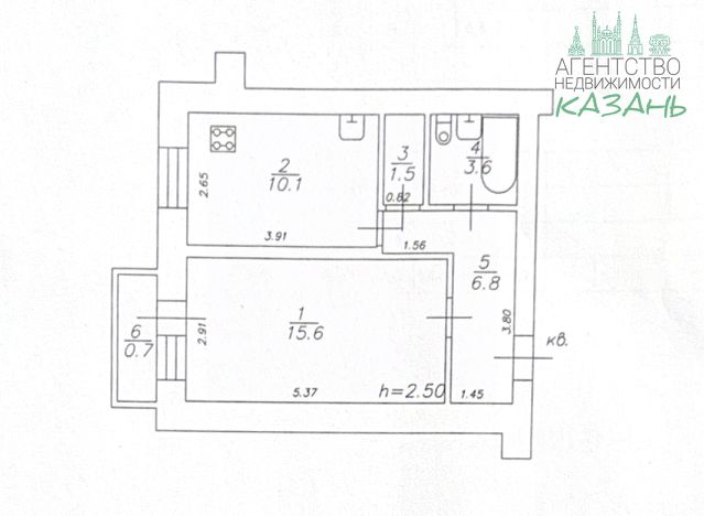 Планировка классическая и удобная: жилая комната 15,6 м², кухня 10,1 м², коридор 6,8 м², санузел, кладовая зона и балкон. Высота потолков — 2,5 м.