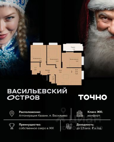 ЖК "Васильевский остров" — масштабный проект ТОЧНО в Казанской агломерации. Просторная территория 88 Га спроектирована для комфортной жизни: озеро с набережной и пляжем, каток, зелёные маршруты. В проекте комплекса — школа на 1 224 места, 2 детских сада на 680 мест, детская и взрослая поликлиники, фитнес-центр с бассейном, термальный комплекс, фермерский рынок, магазины, кафе и рестораны.