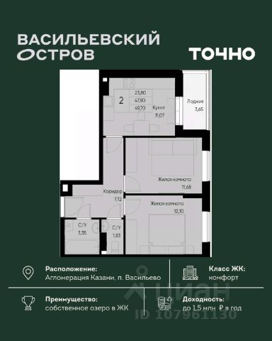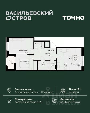 ЖК "Васильевский остров" — масштабный проект ТОЧНО в Казанской агломерации. Просторная территория 88 Га спроектирована для комфортной жизни: озеро с набережной и пляжем, каток, зелёные маршруты. В проекте комплекса — школа на 1 224 места, 2 детских сада на 680 мест, детская и взрослая поликлиники, фитнес-центр с бассейном, термальный комплекс, фермерский рынок, магазины, кафе и рестораны.