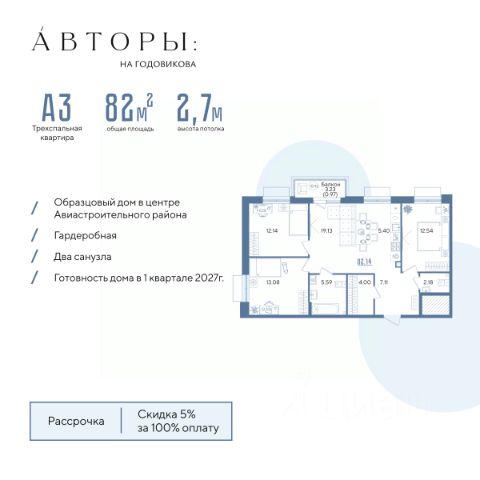 Вы можете приобрести эту квартиру в ипотеку со ставкой от 6% (семейная ипотека). Подробнее - звоните! Продается 3-к квартира 169 в образцовом доме "Авторы на Годовикова" в центре Авиастроительного района. Квартира на 13 этаже площадью 82,14 м², кухней-гостиной и высотой потолков 2,7 м. Квартира сдается в предчистовой отделке со стяжкой полов, предоставляя полную свободу для ваших предпочтений в дизайне. Срок сдачи дома — 1-й квартал 2027 года. Возможно приобретение со скидкой 5% при полной оплате, в рассрочку с первым взносом 30%, а также оформление стандартной ипотеки по интересным условиям. Образцовый дом "Авторы на Годовикова" расположен в тихой зоне, удаленной от активной дороги — на второй линии от улицы Максимова. Соседство с невысокими частными домами открывает превосходный вид из квартиры. Для прогулок на свежем воздухе в шаговой доступности Караваевский парк и парк "Крылья Советов". В соответствии с современными стандартами комфорт-класса "Авторы" предлагают особые решения для вашего комфорта: • Современная архитектура. • Закрытый двор без машин. • Дизайнерские холлы с зонами ожидания и детской комнатой. • Подземный паркинг. • Зона для хвостатых. Двор в концепции траектории полета создает единую линию движения. На территории дома есть многофункциональная зона для йоги и настольных игр, детская зона для комфортных прогулок юных жителей, многофункциональная спортивная площадка со скалолазанием и площадка для выгула собак. Обильное озеленение из 25 видов растений и несколько игровых зон для юных жителей разных возратов: для детей до 3-х лет — песочница, горка и качели; для детей от 4 до 14 лет — большой игровой комплекс, включающий горки, качели, карусели, переговорные трубы и мягкую геопластику, в которой прячутся тоннели. Компания "Авторы" — девелопер на рынке высококлассной недвижимости Казани. Как самостоятельный застройщик компания работает с 2022 года, а в начале 2024 года успешно сдали свой первый проект ЖК "Дом у озера", где 96% квартир были приняты дольщиками с первого раза и без критичных замечаний. Компания входит в ТОП-5 застройщиков РТ по потребительским качествам ЕРЗ. Сейчас компания ведет строительство проектов на ул. Большая, ул. Петербургская, ул. Годовикова и ул. Астрономическая