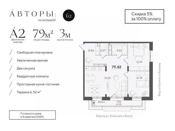 Вы можете приобрести эту квартиру в рассрочку с первоначальным взносом 30% и ежемесячным платежом 50 000 рублей. Подробнее - звоните! Продается 3-к квартира 11 в клубном доме "Авторы на Астрономической" в центре Казани, в шаге от канала Булак. Квартира на 3 этаже площадью 117,2 м², высотой потолков 3 м. Квартира сдается в свободной планировке, предоставляя полную свободу для ваших предпочтений в дизайне и возможность подстроить пространство под ваши жизненные ценности. Срок сдачи дома — 2-й квартал 2027 года. В клубном доме всего 25 квартир от 31м² до 117м². Возможно приобретение с полной оплатой (при полной оплате скидка 10%), в рассрочку с первым взносом 20%, 30% или 50% ( при приобретении в рассрочку с первым взносом 50% возможна скидка до 5% от стоимости), а также оформление ипотеки. Клубный дом "Авторы на Астрономической" в историческом центре Казани, в пешей доступности от Кремля и главных достопримечательностей города. Вы находитесь в самом центре: можно выйти из дома и быстро добраться в любую часть города, даже в час пик. В соответствии с современными стандартами бизнес-класса "Авторы" предлагают особые решения для вашего комфорта: • Тактильная натуральная архитектура из ригельного кирпича ручной формовки. • Закрытая территория с круглосуточным видеонаблюдением. • Трехсекционный двор с высокорослыми растениями и озеленением по философии Хаяо Миядзаки. • Подземный паркинг с умным въездом (распознавание госномеров). • Астро-лобби с круглосуточным консьержем, зонами отдыха и дизайнерской отделкой из натуральных коллекционных материалов для создания атмосферы высокого класса. Особенным пространством в доме станет арт-зал с проекцией 360, которая предоставляет жителям дома возможность быть свидетелями произведений диджитал-художников, а также организовывать просмотры фильмов в формате приватного кинотеатра не выходя из дома. Компания "Авторы" — девелопер на рынке высококлассной недвижимости Казани. Как самостоятельный застройщик компания работает с 2022 года. В портфеле компании один сданный проект, пять клубных домов на этапе строительства и еще три в разработке. Компания входит в ТОП-5 застройщиков ЕРЗ** РТ по потребительским качествам. Сейчас компания ведет строительство проектов на ул. Большая, ул. Петербургская, ул. Годовикова и ул. Астрономическая. Купить квартиру в новостройке бизнес класса в Казани.