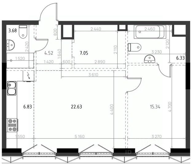 Продуманная планировка: Удобный санузел, просторный коридор с возможностью обустройства гардеробной и функциональная зона кухни-гостиной с панорамным остеклением.