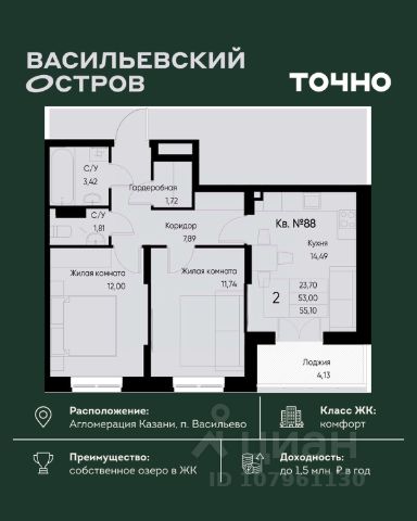 ЖК "Васильевский остров" — масштабный проект ТОЧНО в Казанской агломерации. Просторная территория 88 Га спроектирована для комфортной жизни: озеро с набережной и пляжем, каток, зелёные маршруты. В проекте комплекса — школа на 1 224 места, 2 детских сада на 680 мест, детская и взрослая поликлиники, фитнес-центр с бассейном, термальный комплекс, фермерский рынок, магазины, кафе и рестораны.