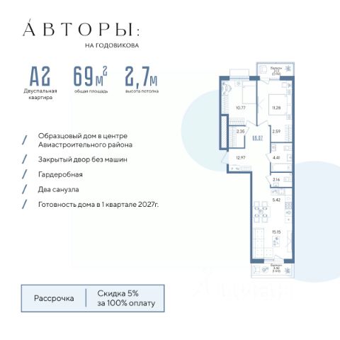 Вы можете приобрести эту квартиру в ипотеку со ставкой от 6% (семейная ипотека). Новоселье уже в этом году! Подробнее - звоните! Продается 2-к квартира 36 в образцовом доме "Авторы на Годовикова" в центре Авиастроительного района. Квартира на 2 этаже площадью 67.67 м², кухней-гостиной и высотой потолков 2.7 м. Квартира сдается в предчистовой отделке со стяжкой полов, предоставляя полную свободу для ваших предпочтений в дизайне. Срок сдачи дома — 1-й квартал 2027 года. Возможно приобретение со скидкой 5% при полной оплате, в рассрочку с первым взносом 30%, а также оформление стандартной ипотеки по интересным условиям. Образцовый дом "Авторы на Годовикова" расположен в тихой зоне, удаленной от активной дороги — на второй линии от улицы Максимова. Соседство с невысокими частными домами открывает превосходный вид из квартиры. Для прогулок на свежем воздухе в шаговой доступности Караваевский парк и парк "Крылья Советов". В соответствии с современными стандартами комфорт-класса "Авторы" предлагают особые решения для вашего комфорта: • Современная архитектура. • Закрытый двор без машин. • Дизайнерские холлы с зонами ожидания и детской комнатой. • Подземный паркинг. • Зона для хвостатых. Двор в концепции траектории полета создает единую линию движения. На территории дома есть многофункциональная зона для йоги и настольных игр, детская зона для комфортных прогулок юных жителей, многофункциональная спортивная площадка со скалолазанием и площадка для выгула собак. Обильное озеленение из 25 видов растений и несколько игровых зон для юных жителей разных возратов: для детей до 3-х лет — песочница, горка и качели; для детей от 4 до 14 лет — большой игровой комплекс, включающий горки, качели, карусели, переговорные трубы и мягкую геопластику, в которой прячутся тоннели. Компания "Авторы" — девелопер на рынке высококлассной недвижимости Казани. Как самостоятельный застройщик компания работает с 2022 года, а в начале 2024 года успешно сдали свой первый проект ЖК "Дом у озера", где 96% квартир были приняты дольщиками с первого раза и без критичных замечаний. Компания входит в ТОП-5 застройщиков РТ по потребительским качествам ЕРЗ. Сейчас компания ведет строительство проектов на ул. Большая, ул. Петербургская, ул. Годовикова и ул. Астрономическая квартира в новостройке с отделкой в районе Авиастроительный в городе Казань.