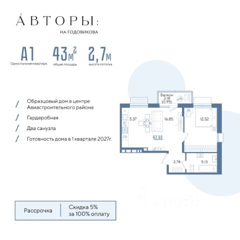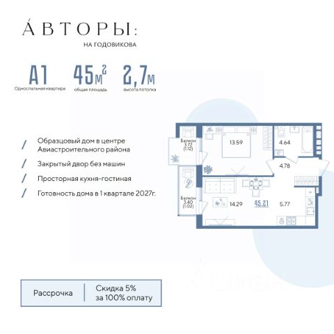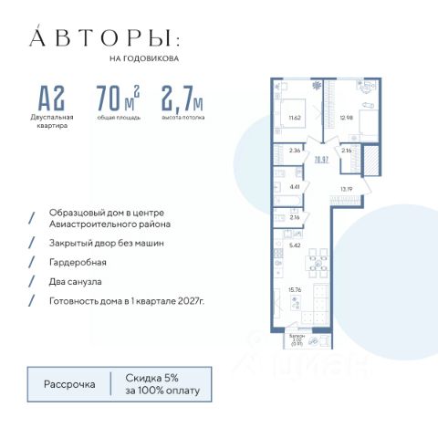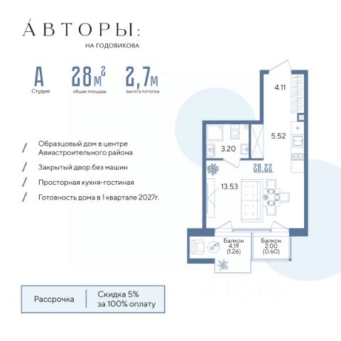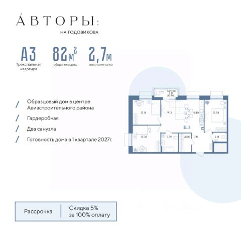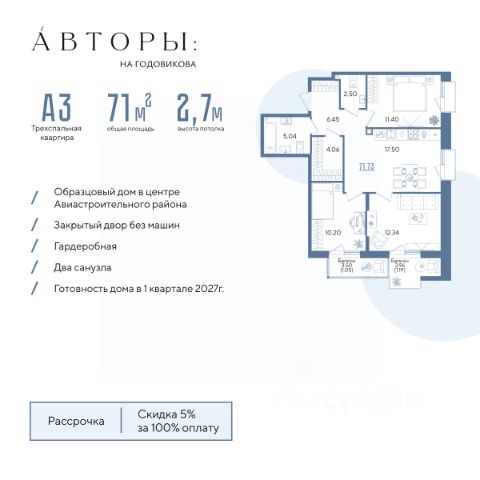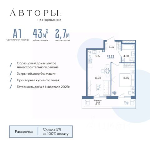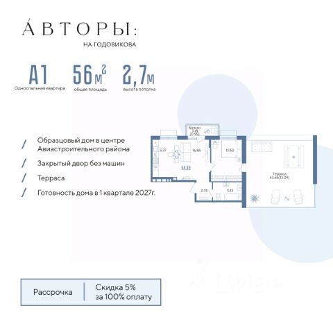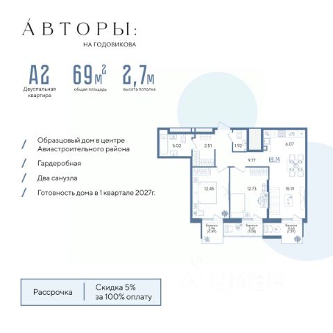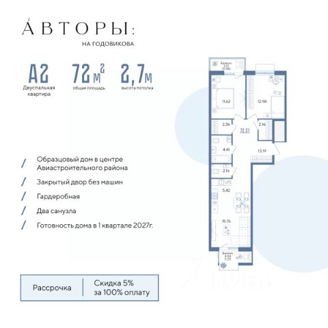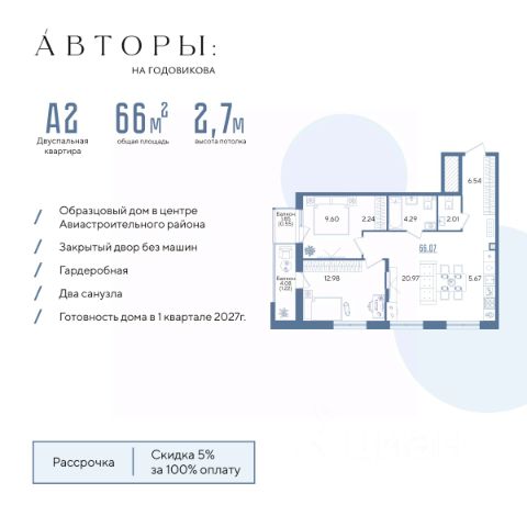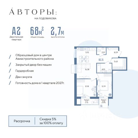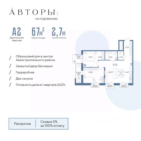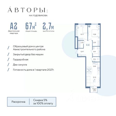 Вы можете приобрести эту квартиру по семейной ипотеке от 6%. Подробнее - звоните! Продается 2-к квартира 36 в образцовом доме "Авторы на Годовикова" в центре Авиастроительного района. Квартира на 2 этаже площадью 67.67 м², кухней-гостиной и высотой потолков 2.7 м. Квартира сдается в предчистовой отделке со стяжкой полов, предоставляя полную свободу для ваших предпочтений в дизайне. Срок сдачи дома — 1-й квартал 2027 года. Возможно приобретение со скидкой 5% при полной оплате, в рассрочку с первым взносом 30%, а также оформление стандартной ипотеки по интересным условиям. Образцовый дом "Авторы на Годовикова" расположен в тихой зоне, удаленной от активной дороги — на второй линии от улицы Максимова. Соседство с невысокими частными домами открывает превосходный вид из квартиры. Для прогулок на свежем воздухе в шаговой доступности Караваевский парк и парк "Крылья Советов". В соответствии с современными стандартами комфорт-класса "Авторы" предлагают особые решения для вашего комфорта: • Современная архитектура. • Закрытый двор без машин. • Дизайнерские холлы с зонами ожидания и детской комнатой. • Подземный паркинг. • Зона для хвостатых. Двор в концепции траектории полета создает единую линию движения. На территории дома есть многофункциональная зона для йоги и настольных игр, детская зона для комфортных прогулок юных жителей, многофункциональная спортивная площадка со скалолазанием и площадка для выгула собак. Обильное озеленение из 25 видов растений и несколько игровых зон для юных жителей разных возратов: для детей до 3-х лет — песочница, горка и качели; для детей от 4 до 14 лет — большой игровой комплекс, включающий горки, качели, карусели, переговорные трубы и мягкую геопластику, в которой прячутся тоннели. Компания "Авторы" — девелопер на рынке высококлассной недвижимости Казани. Как самостоятельный застройщик компания работает с 2022 года, а в начале 2024 года успешно сдали свой первый проект ЖК "Дом у озера", где 96% квартир были приняты дольщиками с первого раза и без критичных замечаний. Компания входит в ТОП-5 застройщиков РТ по потребительским качествам ЕРЗ. Сейчас компания ведет строительство проектов на ул. Большая, ул. Петербургская, ул. Годовикова и ул. Астрономическая квартира в новостройке с отделкой в районе Авиастроительный в городе Казань.