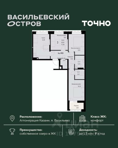 ЖК "Васильевский остров" — масштабный проект ТОЧНО в Казанской агломерации. Просторная территория 88 Га спроектирована для комфортной жизни: озеро с набережной и пляжем, каток, зелёные маршруты. В проекте комплекса — школа на 1 224 места, 2 детских сада на 680 мест, детская и взрослая поликлиники, фитнес-центр с бассейном, термальный комплекс, фермерский рынок, магазины, кафе и рестораны.