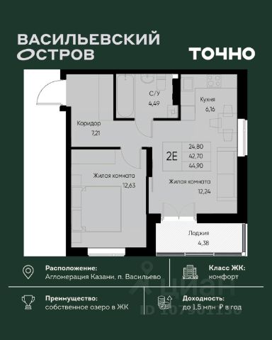 ЖК "Васильевский остров" — масштабный проект ТОЧНО в Казанской агломерации. Просторная территория 88 Га спроектирована для комфортной жизни: озеро с набережной и пляжем, каток, зелёные маршруты. В проекте комплекса — школа на 1 224 места, 2 детских сада на 680 мест, детская и взрослая поликлиники, фитнес-центр с бассейном, термальный комплекс, фермерский рынок, магазины, кафе и рестораны.