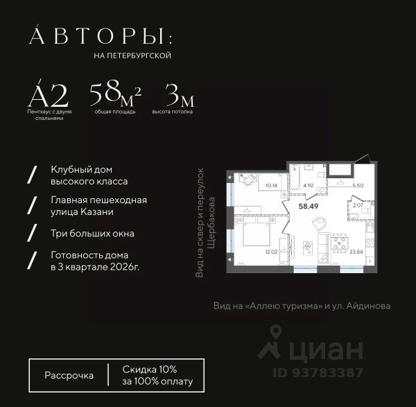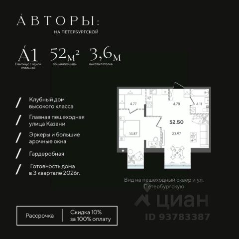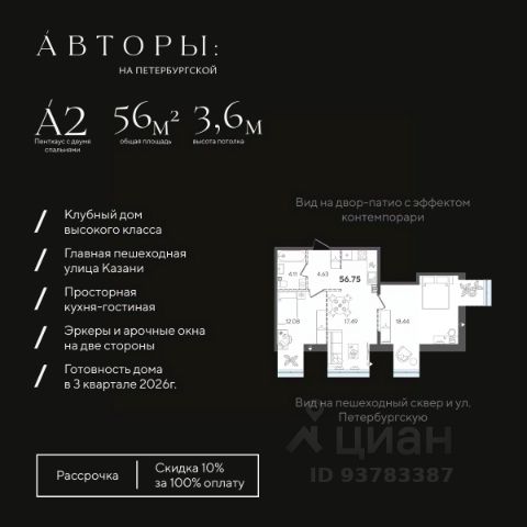 Вы можете приобрести эту квартиру в рассрочку с первоначальным взносом 50% и ежемесячным платежом 100 000 рублей. Подробнее - звоните! Продается 2-к квартира 42 в клубном доме "Авторы на Петербургской" на главной пешеходной улице Казани. Квартира на 4 этаже площадью 59,12 м², высотой потолков 3 м. Квартира сдается в свободной планировке, предоставляя полную свободу для ваших предпочтений в дизайне и возможность подстроить пространство под ваши жизненные ценности. Срок сдачи дома — 3-й квартал 2026 года. В клубном доме всего 68 квартир, включая 18 эксклюзивных пентхаусов. Возможно приобретение (со скидкой 10% при полной оплате, акция действительна до 31.07.2026г.), в рассрочку с первым взносом 50% ( при приобретении в рассрочку с первым взносом 50% возможна скидка до 6% от стоимости), а также оформление ипотеки. Клубный дом "Авторы на Петербургской" расположен на главной пешеходной улице Казани в 3-х минутах до набережной озера "Нижний Кабан". Вы находитесь в самом центре: можно выйти из дома и быстро добраться в любую часть города, даже в час пик. В соответствии с современными стандартами высокого класса "Авторы" предлагают особые решения для вашего комфорта: • Закрытая территория с круглосуточным видеонаблюдением. • Подземный паркинг с электрозаправками, келлеры для хранения, умный въезд с распознаванием номеров. • Натуральные коллекционные материалы в лобби для создания атмосферы премиум-класса. Двор-патио с эффектом контемпорари наполняет территорию дома тишиной и эстетикой, где каждый элемент выглядит как арт-объект, превращая двор в музей современного искусства. Также в пространстве дома есть детская зона — шалаш, где юные жители смогут придумать сотню новых игр с друзьями, а взрослые будут уверены в их безопасности. Компания "Авторы" — девелопер на рынке высококлассной недвижимости Казани. Как самостоятельный застройщик компания работает с 2022 года, а в начале 2024 года успешно сдали свой первый проект ЖК "Дом у озера", где 96% квартир были приняты дольщиками с первого раза и без критичных замечаний. Компания входит в ТОП-5 застройщиков РТ по потребительским качествам ЕРЗ. Сейчас компания ведет строительство проектов на ул. Большая, ул. Петербургская, ул. Годовикова и ул. Астрономическая.