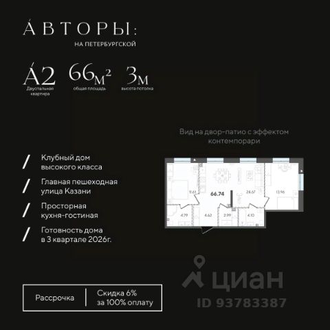Вы можете приобрести эту квартиру в рассрочку с первоначальным взносом 50% и ежемесячным платежом 100 000 рублей. Подробнее - звоните!* Продается 1-к квартира 56 в клубном доме "Авторы на Петербургской" на главной пешеходной улице Казани. Квартира на 3 этаже площадью 37,51 м², высотой потолков 3 м. Квартира сдается в свободной планировке, предоставляя полную свободу для ваших предпочтений в дизайне и возможность подстроить пространство под ваши жизненные ценности. Срок сдачи дома — 3-й квартал 2026 года. В клубном доме всего 68 квартир, включая 18 эксклюзивных пентхаусов. Возможно приобретение со скидкой 6% при полной оплате, в рассрочку с первым взносом 50% или 30%, а также оформление ипотеки. Клубный дом "Авторы на Петербургской" расположен на главной пешеходной улице Казани в 3-х минутах до набережной озера "Нижний Кабан". Вы находитесь в самом центре: можно выйти из дома и быстро добраться в любую часть города, даже в час пик. В соответствии с современными стандартами бизнес-класса "Авторы" предлагают особые решения для вашего комфорта: • Закрытая территория с круглосуточным видеонаблюдением. • Подземный паркинг с электрозаправками, келлеры для хранения, умный въезд с распознаванием номеров. • Натуральные коллекционные материалы в лобби для создания атмосферы премиум-класса. Двор-патио с эффектом контепорари наполняет территорию дома тишиной и эстетикой, где каждый элемент выглядит как арт-объект, превращая двор в музей современного искусства. Также в пространстве дома есть детская зона — шалаш, где юные жители смогут придумать сотню новых игр с друзьями, а взрослые будут уверены в их безопасности. Компания "Авторы" — девелопер на рынке высококлассной недвижимости Казани. Как самостоятельный застройщик компания работает с 2022 года, а в начале 2024 года успешно сдали свой первый проект ЖК "Дом у озера", где 96% квартир были приняты дольщиками с первого раза и без критичных замечаний. Компания входит в ТОП-5 застройщиков РТ по потребительским качествам ЕРЗ. Сейчас компания ведет строительство проектов на ул. Большая, ул. Петербургская, ул. Годовикова и ул. Астрономическая