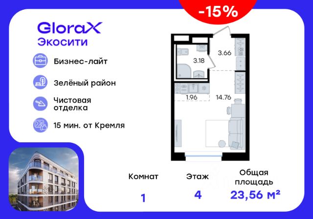 Продается квартира-студия на 4-м этаже в строящемся проекте GloraX Экосити. Общая площадь лота составляет 23,56 кв. м, из которых 14,76 кв. м отведено под жилую и 1,96 кв. м под кухонную зону. Номер квартиры - 264 Преимущества квартиры: • Квартира с полностью чистовой отделкой. В комнатах и коридоре: - натяжной потолок, - стены оклеены обоями под покраску, - полы: ламинат, плинтусы и напольная плитки - установлены межкомнатные двери и подоконники. В санузлах: - на стенах - керамогранитная плитка и/или окраска водостойкой краской - на полу - керамогранитная плитка; - натяжной потолок - сантехника: ванна и экран под ванну/душевой поддон, унитаз, раковины и смесители, монтаж водопровода и канализации - Предусмотрен расширенный пакет системы Умный Дом: бесключевой доступ в подъезд, видеодомофон с функцией Face ID, видеонаблюдение, автоматизированный сбор и передача показаний счётчиков; - Внутренние дворы каждого урбан-блока закрытые, благоустройство по индивидуальному проекту. - На территории квартала предусмотрено строительство детского сада на 360 мест, школы на 1501 место, ДОУ на 2000 мест. - На первых этажах домов запроектированы коммерческие помещения - предусмотрены места для супермаркетов, бытовых услуг, кафе. - Собственный комьюнити-центр для жителей жилого комплекса - бульвар "Река между камней" с плейхабом для детей, амфитеатром, спортивными зонами, аллеей достижений. Всем посетителям будет доступен иммерсивный маршрут и AR-игры. - лесная прогулочная аллея вдоль которой расположатся зоны тихого отдыха, йоги и медитаций - 2 смотровые площадки - специальная зона для выгула собак - В жилом комплексе предусмотрено строительство 2 многоэтажных паркингов на 300 и 360 машиномест. Всем жителям проекта доступен и привычный плоскостной паркинг вокруг территории проекта с возможностью в приложении дома получить информацию о наличии парковочных мест. GloraX Экосити — это совершенство города в первозданной природе. Наполненный возможностями район, в котором вы не выбираете между городом или природой, семьей или работой, отдыхом или спортом, — вы берете всё сразу. Каждая семья, каким бы составом она ни жила, найдет для себя идеальное пространство. Планировочные решения запроектированы с просторной кухней-гостиной, чтобы семья могла комфортно проводить время вместе. В целях безопасности в детских комнатах отсутствуют балконы и лоджии. Квартиры сдаются с современной качественной отделкой, что позволяет после сдачи дома сразу начать жить, избежав долгих самостоятельных ремонтов. Цветовые решения и стиль отделки можно выбрать при покупке квартиры. Цена указана при 100% оплате или стандартной ипотеке. Узнайте подробности в Отделе продаж.