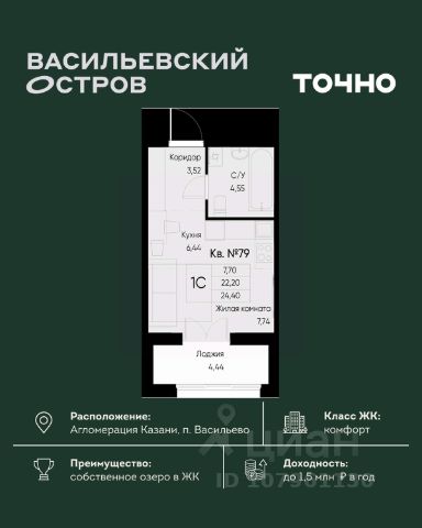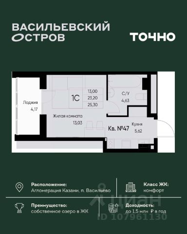 Продается 1-комн. квартира на 3-м этаже в строящемся проекте GloraX Экосити. Общая площадь лота составляет 46,38 кв. м, из которых 13,67 кв. м отведено под жилую и 16,99 кв. м под кухонную зону. Номер квартиры - 17
