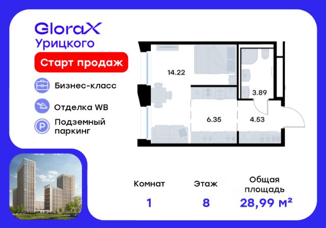 Продается квартира-студия на 2-м этаже в квартале бизнес-класса GloraX Урицкого. Общая площадь лота составляет 32,53 кв. м, из которых 16,30 кв. м отведено под жилую и 5,00 кв. м под кухонную зону. Номер квартиры - 204 GloraX Урицкого это идеальное сочетание динамики мегаполиса и камерности района, где каждое утро начинается легко, а каждый вечер наполнен ощущением дома Преимущества квартиры: cтудия; гардеробная; вид во двор. Преимущества, которые изменят вашу жизнь: • Собственная инфраструктура: Всё для комфорта и досуга, не выходя за территорию проекта • Безопасность 24/7: Закрытая территория, видеонаблюдение, система "Умный дом" • Безбарьерная среда: Забота о каждом жителе, независимо от возраста • Футуристичные лобби: Эстетика и комфорт с первых шагов в вашем доме. • Колясочные в каждой секции: Больше пространства в ваших квартирах • Квартиры в отделке White Box: Готовый холст для реализации дизайнерских идей. • Благоустройство в стиле лесопарка: эко-пространство, где природа становится частью повседневной жизни. GloraX Урицкого это проект бизнес-класса для тех, кто живёт в ритме большого города, но ждёт безмятежности у себя дома. Здесь всё важное происходит рядом с вами: работа, встречи, спортивные и культурные активности, прогулки, образование и обучение. Здесь вы ощутите, что вы наконец-то дома — в доме, которого давно ждали. Стоимость действительна при 100% оплате или стандартной ипотеке.