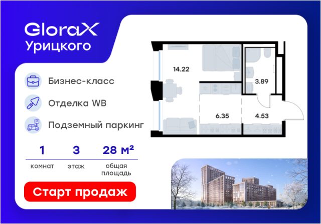 Продается квартира-студия на 3-м этаже в квартале бизнес-класса GloraX Урицкого. Общая площадь лота составляет 29,61 кв. м, из которых 14,20 кв. м отведено под жилую и 6,30 кв. м под кухонную зону. Номер квартиры - 264 GloraX Урицкого это идеальное сочетание динамики мегаполиса и камерности района, где каждое утро начинается легко, а каждый вечер наполнен ощущением дома Преимущества квартиры: cтудия; вид во двор. Преимущества, которые изменят вашу жизнь: • Собственная инфраструктура: Всё для комфорта и досуга, не выходя за территорию проекта • Безопасность 24/7: Закрытая территория, видеонаблюдение, система "Умный дом" • Безбарьерная среда: Забота о каждом жителе, независимо от возраста • Футуристичные лобби: Эстетика и комфорт с первых шагов в вашем доме. • Колясочные в каждой секции: Больше пространства в ваших квартирах • Квартиры в отделке White Box: Готовый холст для реализации дизайнерских идей. • Благоустройство в стиле лесопарка: эко-пространство, где природа становится частью повседневной жизни. GloraX Урицкого это проект бизнес-класса для тех, кто живёт в ритме большого города, но ждёт безмятежности у себя дома. Здесь всё важное происходит рядом с вами: работа, встречи, спортивные и культурные активности, прогулки, образование и обучение. Здесь вы ощутите, что вы наконец-то дома — в доме, которого давно ждали. Стоимость действительна при 100% оплате или стандартной ипотеке.